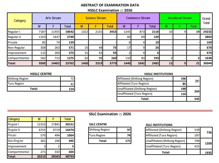 Shillong, January 30: A total of 48,793 students have appeared for the Secondary School Leaving Certificate (SSLC) Examination 2026 conducted by the Meghalaya Board of School Education (MBOSE), according to official data released by the Board.