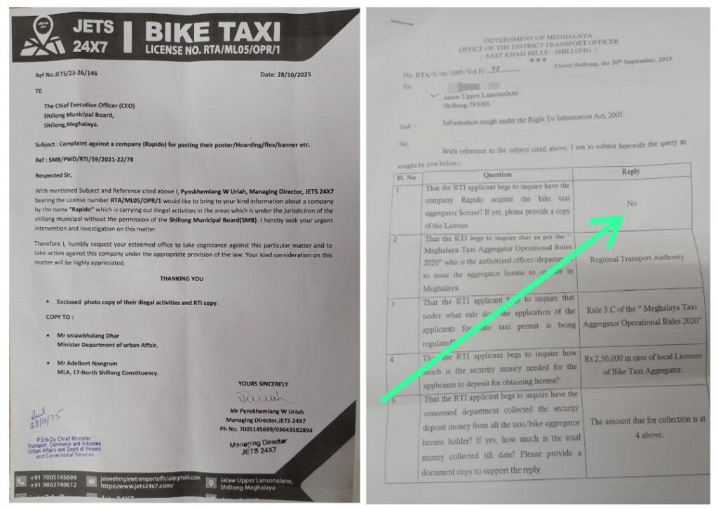 Supporting the allegations, an RTI response issued by the Shillong Municipal Board on October 13, 2025, categorically stated that no permission was granted to Rapido for putting up posters, hoardings, flex banners, or any other promotional materials within the Board’s jurisdiction.
